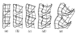 | direttrici fluide su fondo geometrico organico | una trasformazione geometrica intrinseca all'organico | processo di de-conformazione topologicaRESCITA E FORMA | ||